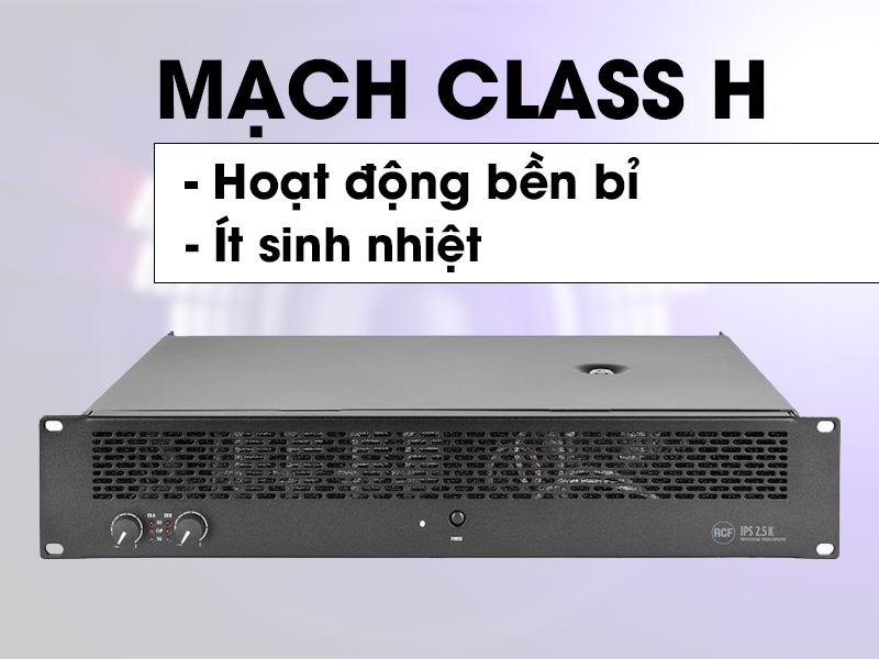 Cục đẩy công suất RCF IPS 2.5K sử dụng mạch công suất class H, được đánh giá cao về độ bền và hiệu suất làm việc. Mạch class H giúp sản phẩm có khả năng điều chỉnh điện áp đầu ra linh hoạt và đáp ứng tốt với các yêu cầu giao động của âm thanh, đồng thời giảm thiểu đáng kể lượng nhiệt sinh ra.