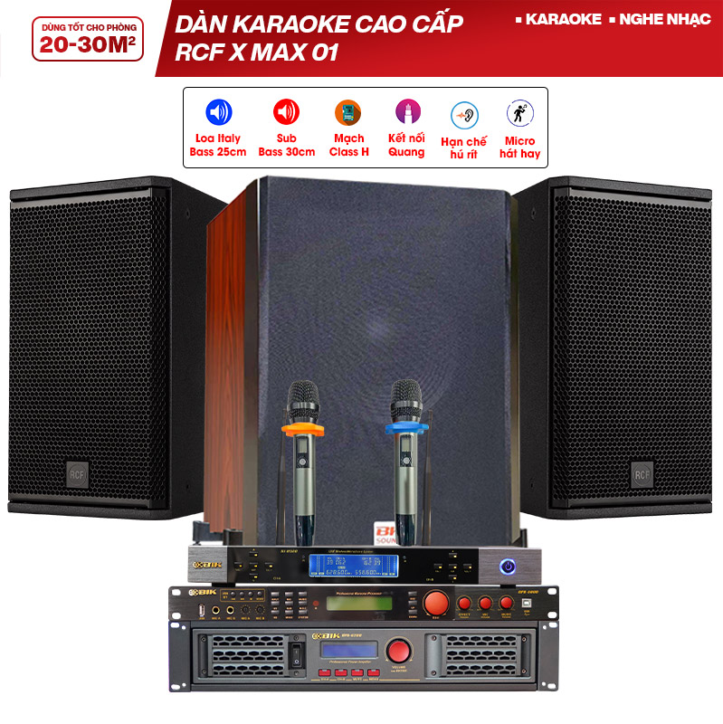 Dàn karaoke cao cấp RCF X-MAX 01 phối ghép chính hãng RCF, BIK, BKSound cho phòng hát gia đình, kinh doanh, hội trường, sân khấu với diện tích 20-30 m2.