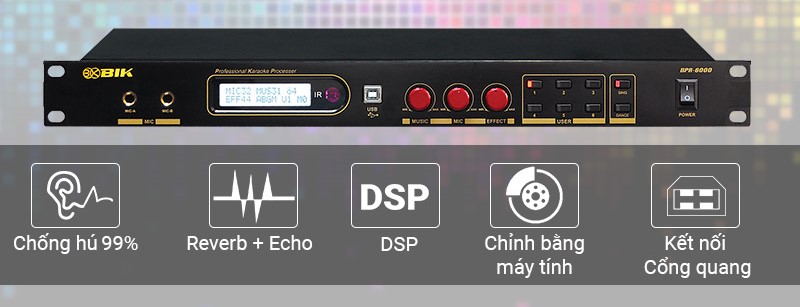 Sử dụng bộ xử lý DSP điểm nổi 32 bit, tốc độ lấy mẫu 48kHz, chuyển đổi AD / DA 24 bit nên có khả năng kiểm soát âm thanh cực chuẩn và cắt hú rít cực tốt. Vang số BIK BPR-6000 tích hợp 4 đầu vào mic, có thể kết nối 2 bộ xử lý mic độc lập, EQ 8 băng tần mang đến khả năng lựa chọn, chia sẻ một cách tối đa.